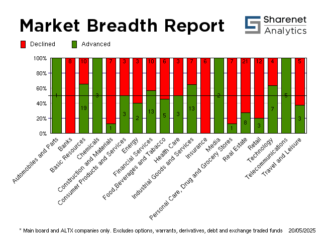 | | | Index Name | RP | Move | % Move | | FTSE/JSE Technology | 63,277.08 | -657.44 | -1.03% | | SHARIAH TOP40 | 4,171.87 | 91 | 2.24% | | FTSE/JSE SHARIAH ALL | 4,923.99 | 91 | 1.89% | | FTSE JSE Fledgling | 9,908.99 | -35 | -0.35% | | LARGE CAP | 95,851.71 | 107 | 0.11% | | FTSE/JSE TOP 40 USD | 5,109.22 | 1612 | 46.09% | | FTSE/JSE Alt X | 583.68 | 33 | 6.06% | | FTSE/JSE AFRICA ALTX 15 | 302.91 | 50 | 19.70% | | SA LISTED PROPERTY | 398.82 | -5.27 | -1.30% | | CAPPED PROPERTY | 287.73 | | -1.17% | | RESOURCE | 39,621.23 | 1281 | 3.34% | | DIVIDEND PLUS | 252.39 | 1 | 0.37% | | FTSE/JSE RAFI 40 | 16,686.41 | 249 | 1.52% | | FTSE/JSE RAFI ALLSHARE | 15,349.42 | 196 | 1.29% | | Capped Top 40 | 42,654.83 | 192 | 0.45% | | Capped All Share | 46,125.40 | 164 | 0.36% | | CAPPED INDUSTRIAL 25 | 126,436.19 | | 68.93% | | All Share Style Value | 468.86 | 0 | 0.00% | | All Share Style Growth | 1,364.75 | 0 | 0.00% | | JSE ALL PROPERTY | 9,901.77 | -114.74 | -1.15% | | ALL SHARE NET TRI | 92,763.22 | 271 | 0.29% | | JSE SWIX ALSI NET TRI | 17,513.28 | 51 | 0.29% | | FTSE/JSE Leisure Goods | 1,350.00 | 0 | 0.00% | | FTSE/JSE Retailers | 7,094.99 | -138 | -1.91% | | FTSE/JSE Tobacco | 10,094.81 | 128 | 1.28% |