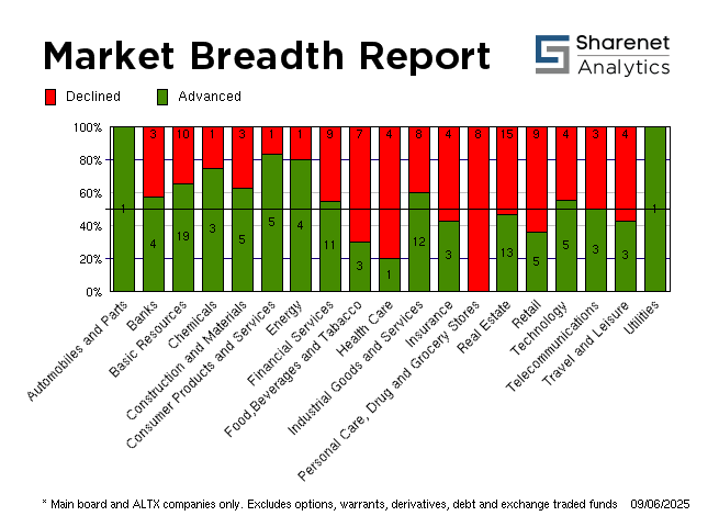 | | | Index Name | RP | Move | % Move | | FTSE/JSE Technology | 65,938.89 | 799.32 | 1.23% | | SHARIAH TOP40 | 4,417.20 | 22 | 0.49% | | FTSE/JSE SHARIAH ALL | 5,196.38 | 17 | 0.32% | | FTSE JSE Fledgling | 10,407.24 | 72 | 0.70% | | LARGE CAP | 99,472.06 | 108 | 0.11% | | FTSE/JSE TOP 40 USD | 5,383.34 | 1886 | 53.93% | | FTSE/JSE Alt X | 630.36 | 9 | 1.44% | | FTSE/JSE AFRICA ALTX 15 | 371.15 | 12 | 3.41% | | SA LISTED PROPERTY | 409.39 | .06 | 0.01% | | CAPPED PROPERTY | 296.88 | | 0.03% | | RESOURCE | 43,091.77 | 441 | 1.03% | | DIVIDEND PLUS | 263.52 | -1 | -0.23% | | FTSE/JSE RAFI 40 | 17,770.86 | 68 | 0.38% | | FTSE/JSE RAFI ALLSHARE | 16,258.18 | 42 | 0.26% | | Capped Top 40 | 44,347.40 | 1 | 0.00% | | Capped All Share | 47,933.06 | -3 | -0.01% | | CAPPED INDUSTRIAL 25 | 129,059.58 | | 72.43% | | All Share Style Value | 497.25 | 0 | 0.00% | | All Share Style Growth | 1,400.66 | 0 | 0.00% | | JSE ALL PROPERTY | 10,219.05 | 3.54 | 0.03% | | ALL SHARE NET TRI | 96,413.48 | 47 | 0.05% | | JSE SWIX ALSI NET TRI | 18,202.43 | 9 | 0.05% | | FTSE/JSE Leisure Goods | 1,350.00 | 0 | 0.00% | | FTSE/JSE Retailers | 7,173.43 | -229 | -3.09% | | FTSE/JSE Tobacco | 10,755.70 | -58 | -0.53% |