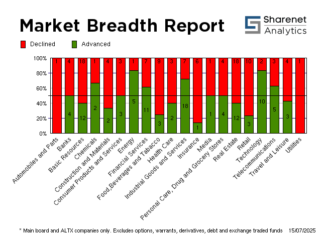 | Index Name | RP | Move | % Move | | Top 40 | 89,303.82 | 256.28 | 0.29% | | Industrial | 144,840.28 | 685.27 | 0.48% | | Mid Cap | 98,195.96 | -102.88 | -0.10% | | Small Cap | 93,271.58 | -375.34 | -0.40% | | Resource 20 | 80,245.04 | -115.78 | -0.14% | | Industrial 25 | 136,566.33 | 740.01 | 0.54% | | Financial 15 | 20,715.46 | 45.91 | 0.22% | | Financial 30 | 131,974.95 | 570.37 | 0.43% | | All Share | 97,019.36 | 219.70 | 0.23% | | FTSE/JSE Energy | 23,351.88 | 475.99 | 2.08% | | FTSE/JSE Basic Materials | 56,915.21 | -96.88 | -0.17% | | FTSE/JSE Chemicals | 6,311.37 | -132.86 | -2.06% | | FTSE/JSE Industrials | 36,327.83 | -83.31 | -0.23% | | FTSE/JSE Consumer Staples | 96,703.88 | -351.49 | -0.36% | | FTSE/JSE Health Care | 3,994.31 | -1.63 | -0.04% | | FTSE/JSE Beverages | 233.10 | -2.78 | -1.18% | | FTSE/JSE Food Producers | 8,260.01 | -8.23 | -0.10% | | FTSE/JSE Personal Goods | 3,354.66 | -.42 | -0.01% | | FTSE/JSE Travel & Leisure | 3,550.67 | -16.71 | -0.47% | | FTSE/JSE Media | 825.99 | .00 | 0.00% | | FTSE/JSE Real Estate | 1,424.02 | -3.94 | -0.28% | | FTSE/JSE SA Financials | 51,328.68 | 73.67 | 0.14% | | FTSE/JSE Financials | 52,791.87 | 114.75 | 0.22% | | FTSE/JSE Banks | 12,447.02 | 77.08 | 0.62% | | FTSE/JSE Life Insurance | 45,264.35 | -195.76 | -0.43% |