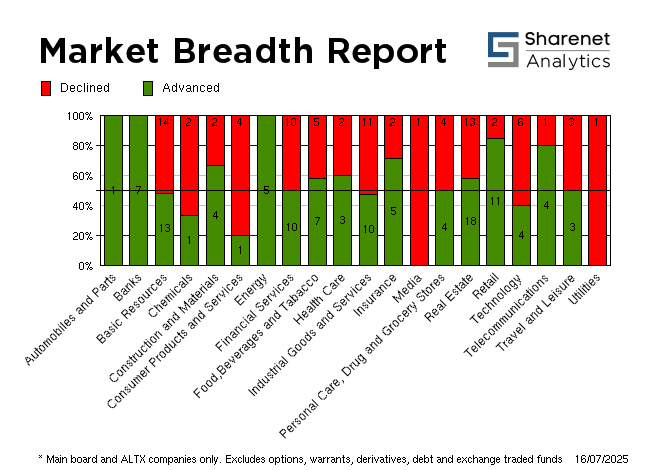 | | | Index Name | RP | Move | % Move | | FTSE/JSE Technology | 66,860.92 | -646.46 | -0.96% | | SHARIAH TOP40 | 4,486.63 | -30 | -0.65% | | FTSE/JSE SHARIAH ALL | 5,271.40 | -26 | -0.48% | | FTSE JSE Fledgling | 10,542.69 | 3 | 0.03% | | LARGE CAP | 99,640.79 | -80 | -0.08% | | FTSE/JSE TOP 40 USD | 5,365.08 | 1868 | 53.41% | | FTSE/JSE Alt X | 604.93 | 1 | 0.19% | | FTSE/JSE AFRICA ALTX 15 | 326.98 | 2 | 0.53% | | SA LISTED PROPERTY | 413.39 | .73 | 0.18% | | CAPPED PROPERTY | 300.40 | | 0.13% | | RESOURCE | 44,496.52 | -602 | -1.33% | | DIVIDEND PLUS | 267.23 | 2 | 0.71% | | FTSE/JSE RAFI 40 | 18,397.35 | 32 | 0.18% | | FTSE/JSE RAFI ALLSHARE | 16,773.66 | 35 | 0.21% | | Capped Top 40 | 44,618.68 | 32 | 0.07% | | Capped All Share | 48,236.22 | 44 | 0.09% | | CAPPED INDUSTRIAL 25 | 129,521.42 | | 73.05% | | All Share Style Value | 506.33 | 0 | 0.00% | | All Share Style Growth | 1,396.12 | 0 | 0.00% | | JSE ALL PROPERTY | 10,318.70 | 14.65 | 0.14% | | ALL SHARE NET TRI | 97,064.25 | 45 | 0.05% | | JSE SWIX ALSI NET TRI | 18,325.29 | 8 | 0.05% | | FTSE/JSE Leisure Goods | 1,350.00 | 0 | 0.00% | | FTSE/JSE Retailers | 6,850.58 | 92 | 1.36% | | FTSE/JSE Tobacco | 11,832.27 | 191 | 1.64% |