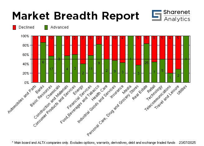| | | Index Name | RP | Move | % Move | | FTSE/JSE Technology | 71,535.67 | 3261.12 | 4.78% | | SHARIAH TOP40 | 4,704.25 | -19 | -0.39% | | FTSE/JSE SHARIAH ALL | 5,492.03 | -15 | -0.27% | | FTSE JSE Fledgling | 10,516.03 | 6 | 0.06% | | LARGE CAP | 103,030.41 | 961 | 0.94% | | FTSE/JSE TOP 40 USD | 5,661.38 | 2164 | 61.88% | | FTSE/JSE Alt X | 640.76 | 3 | 0.47% | | FTSE/JSE AFRICA ALTX 15 | 380.13 | 4 | 1.19% | | SA LISTED PROPERTY | 420.10 | 3.15 | 0.76% | | CAPPED PROPERTY | 305.76 | | 0.88% | | RESOURCE | 47,850.92 | 132 | 0.28% | | DIVIDEND PLUS | 274.17 | 1 | 0.24% | | FTSE/JSE RAFI 40 | 19,178.08 | 155 | 0.82% | | FTSE/JSE RAFI ALLSHARE | 17,416.97 | 126 | 0.73% | | Capped Top 40 | 46,067.80 | 290 | 0.63% | | Capped All Share | 49,700.49 | 339 | 0.69% | | CAPPED INDUSTRIAL 25 | 131,755.87 | | 76.03% | | All Share Style Value | 521.24 | 0 | 0.00% | | All Share Style Growth | 1,422.21 | 0 | 0.00% | | JSE ALL PROPERTY | 10,504.77 | 90.79 | 0.87% | | ALL SHARE NET TRI | 100,179.84 | 855 | 0.86% | | JSE SWIX ALSI NET TRI | 18,913.50 | 161 | 0.86% | | FTSE/JSE Leisure Goods | 1,350.00 | 0 | 0.00% | | FTSE/JSE Retailers | 6,776.09 | -31 | -0.45% | | FTSE/JSE Tobacco | 11,660.28 | 25 | 0.22% |