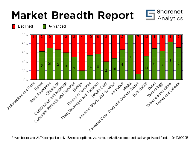 | | | Index Name | RP | Move | % Move | | FTSE/JSE Technology | 68,244.46 | 1939.80 | 2.93% | | SHARIAH TOP40 | 4,671.60 | 55 | 1.19% | | FTSE/JSE SHARIAH ALL | 5,427.65 | 52 | 0.97% | | FTSE JSE Fledgling | 10,408.05 | -8 | -0.07% | | LARGE CAP | 101,901.43 | 1416 | 1.41% | | FTSE/JSE TOP 40 USD | 5,442.25 | 1945 | 55.61% | | FTSE/JSE Alt X | 647.76 | -8 | -1.27% | | FTSE/JSE AFRICA ALTX 15 | 351.98 | -12 | -3.39% | | SA LISTED PROPERTY | 417.29 | -.10 | -0.02% | | CAPPED PROPERTY | 303.58 | | 0.07% | | RESOURCE | 46,168.29 | 798 | 1.76% | | DIVIDEND PLUS | 266.67 | -0 | -0.02% | | FTSE/JSE RAFI 40 | 18,591.25 | 153 | 0.83% | | FTSE/JSE RAFI ALLSHARE | 16,930.25 | 124 | 0.74% | | Capped Top 40 | 45,573.89 | 474 | 1.05% | | Capped All Share | 49,060.71 | 457 | 0.94% | | CAPPED INDUSTRIAL 25 | 130,056.93 | | 73.76% | | All Share Style Value | 511.80 | 0 | 0.00% | | All Share Style Growth | 1,402.38 | 0 | 0.00% | | JSE ALL PROPERTY | 10,426.16 | 3.31 | 0.03% | | ALL SHARE NET TRI | 98,744.78 | 1001 | 1.02% | | JSE SWIX ALSI NET TRI | 18,642.57 | 189 | 1.02% | | FTSE/JSE Leisure Goods | 1,350.00 | 0 | 0.00% | | FTSE/JSE Retailers | 6,753.69 | 13 | 0.19% | | FTSE/JSE Tobacco | 12,633.47 | 98 | 0.78% |