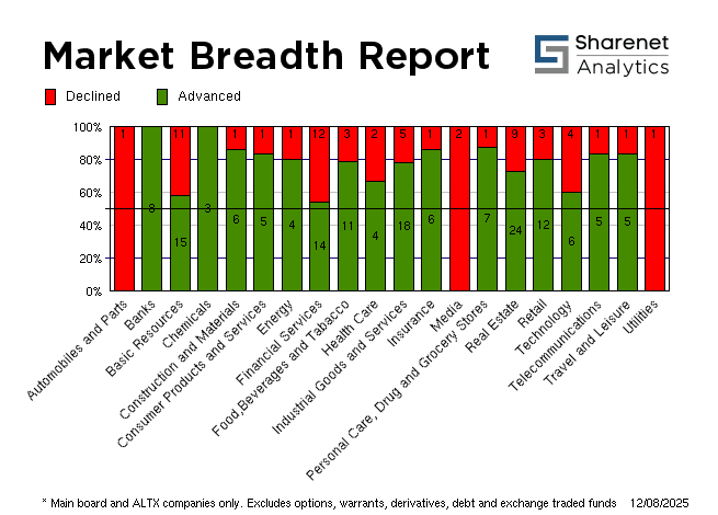 | | | Index Name | RP | Move | % Move | | FTSE/JSE Technology | 68,431.23 | 187.59 | 0.27% | | SHARIAH TOP40 | 5,004.91 | 47 | 0.95% | | FTSE/JSE SHARIAH ALL | 5,740.59 | 53 | 0.93% | | FTSE JSE Fledgling | 10,507.23 | 17 | 0.16% | | LARGE CAP | 105,645.94 | 731 | 0.70% | | FTSE/JSE TOP 40 USD | 5,718.10 | 2221 | 63.50% | | FTSE/JSE Alt X | 652.21 | -2 | -0.27% | | FTSE/JSE AFRICA ALTX 15 | 361.96 | -3 | -0.87% | | SA LISTED PROPERTY | 428.54 | 2.03 | 0.48% | | CAPPED PROPERTY | 310.99 | | 0.55% | | RESOURCE | 49,627.59 | 348 | 0.71% | | DIVIDEND PLUS | 270.40 | 3 | 1.20% | | FTSE/JSE RAFI 40 | 19,117.43 | 164 | 0.86% | | FTSE/JSE RAFI ALLSHARE | 17,364.28 | 147 | 0.85% | | Capped Top 40 | 47,029.13 | 342 | 0.73% | | Capped All Share | 50,399.16 | 362 | 0.72% | | CAPPED INDUSTRIAL 25 | 131,972.77 | | 76.32% | | All Share Style Value | 518.86 | 0 | 0.00% | | All Share Style Growth | 1,463.72 | 0 | 0.00% | | JSE ALL PROPERTY | 10,676.25 | 60.19 | 0.57% | | ALL SHARE NET TRI | 101,337.51 | 707 | 0.70% | | JSE SWIX ALSI NET TRI | 19,132.06 | 134 | 0.70% | | FTSE/JSE Leisure Goods | 1,350.00 | 0 | 0.00% | | FTSE/JSE Retailers | 6,533.99 | -6 | -0.10% | | FTSE/JSE Tobacco | 13,153.29 | 49 | 0.38% |