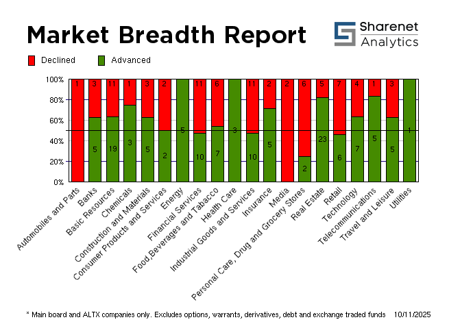 | | | Index Name | RP | Move | % Move | | FTSE/JSE Technology | 77,075.84 | 1824.42 | 2.42% | | SHARIAH TOP40 | 5,705.95 | 179 | 3.24% | | FTSE/JSE SHARIAH ALL | 6,447.14 | 183 | 2.92% | | FTSE JSE Fledgling | 11,212.78 | -40 | -0.36% | | LARGE CAP | 116,659.64 | 2284 | 2.00% | | FTSE/JSE TOP 40 USD | 6,477.10 | 2980 | 85.20% | | FTSE/JSE Alt X | 626.64 | 14 | 2.33% | | FTSE/JSE AFRICA ALTX 15 | 314.76 | 23 | 7.96% | | SA LISTED PROPERTY | 469.24 | 3.01 | 0.65% | | CAPPED PROPERTY | 338.55 | | 0.64% | | RESOURCE | 60,031.27 | 2313 | 4.01% | | DIVIDEND PLUS | 278.79 | 2 | 0.57% | | FTSE/JSE RAFI 40 | 21,152.88 | 453 | 2.19% | | FTSE/JSE RAFI ALLSHARE | 19,044.95 | 379 | 2.03% | | Capped Top 40 | 51,708.04 | 989 | 1.95% | | Capped All Share | 55,054.36 | 977 | 1.81% | | CAPPED INDUSTRIAL 25 | 135,536.30 | | 81.08% | | All Share Style Value | 551.58 | 0 | 0.00% | | All Share Style Growth | 1,607.06 | 0 | 0.00% | | JSE ALL PROPERTY | 11,637.02 | 75.32 | 0.65% | | ALL SHARE NET TRI | 110,841.60 | 1995 | 1.83% | | JSE SWIX ALSI NET TRI | 20,926.39 | 377 | 1.83% | | FTSE/JSE Leisure Goods | 1,350.00 | 0 | 0.00% | | FTSE/JSE Retailers | 6,353.44 | 26 | 0.41% | | FTSE/JSE Tobacco | 11,995.07 | -89 | -0.73% |